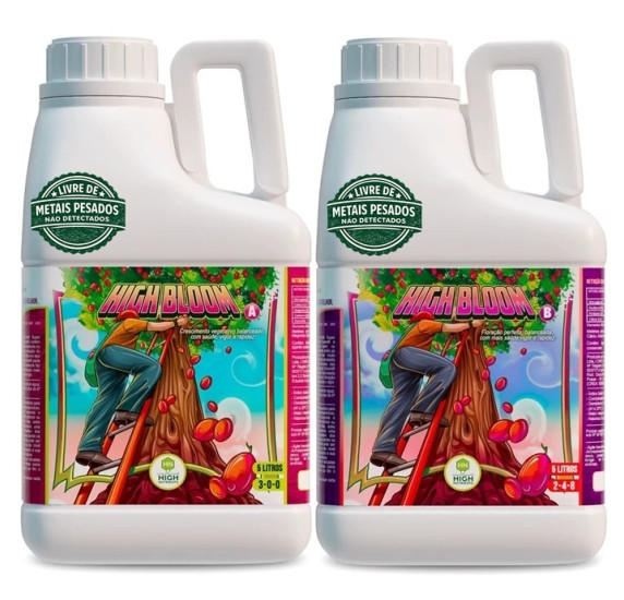 As bases de floração High Bloom® A + B foram desenvolvidas especialmente para os cultivadores brasileiros e formuladas com baixíssima salinidade, ajudando a reduzir bloqueios nutricionais e permitindo que a planta absorva com eficiência os nutrientes e suplementos utilizados durante a fase reprodutiva.